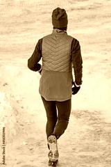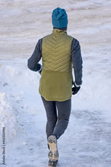 A young athlete runs on a snow-covered sidewalk on a cold winter day