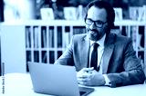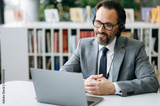 Happy caucasian businessman at video conference, talking with colleagues about work process. Stylish mature manager in headset and eyeglasses is using laptop, sitting at the desk, smiling