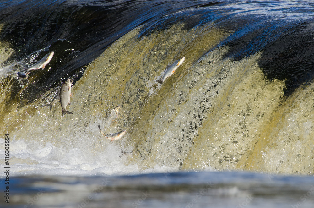 Fishes go for spawning upstream. Vimba jumps over waterfall on the Venta River, Kuldiga, Latvia.