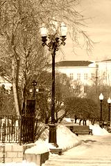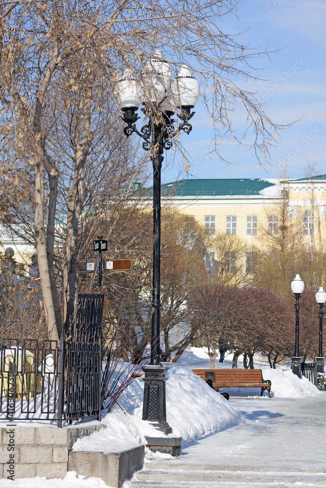 Winter view of the street lighting lamp in the historical part of the Eastern European city
