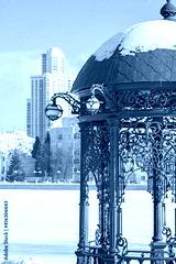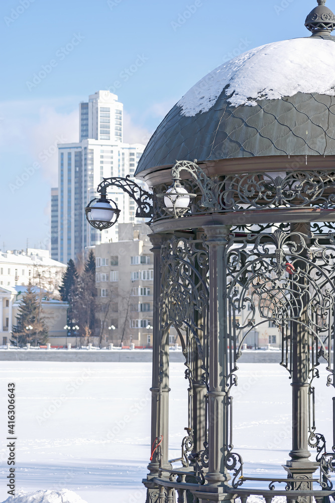 Winter view of the rotunda made of black cast iron on the shore of the city pond