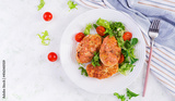 Meatballs with cabbage. Lazy cabbage rolls with fresh salad on light background. Russian cuisine. Top view, above, copy space