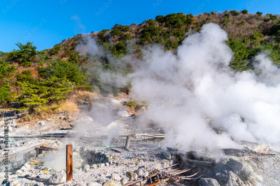 日本にある長崎県の観光名所「雲仙地獄」と「雲仙温泉」の写真