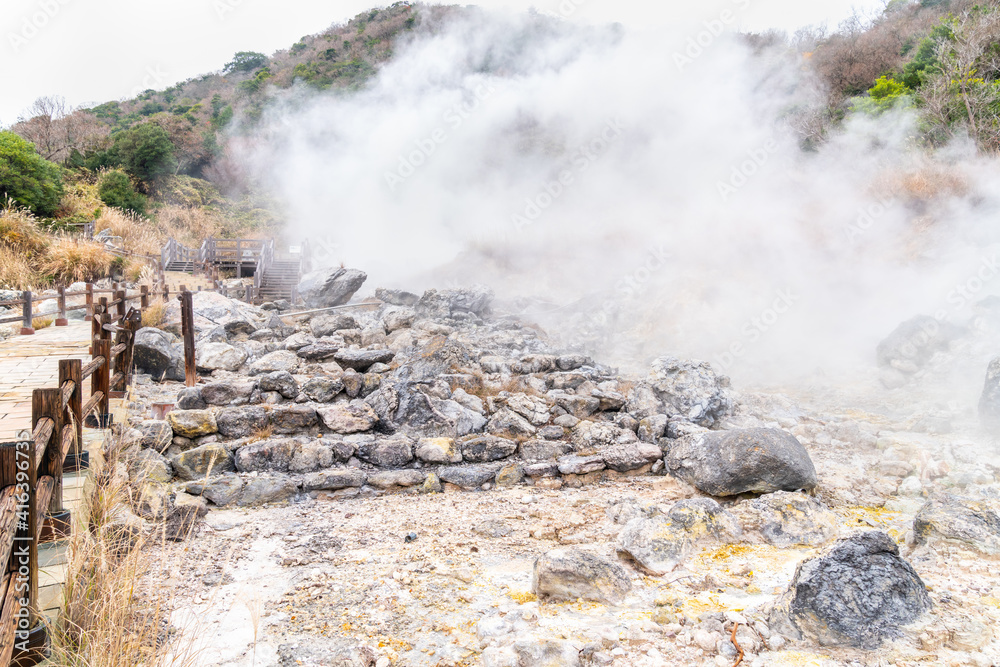 日本にある長崎県の観光名所「雲仙地獄」と「雲仙温泉」の写真