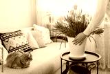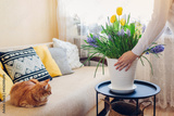 Woman puts pot with spring flowers on table. Housewife taking care of coziness in apartment. Interior and decor