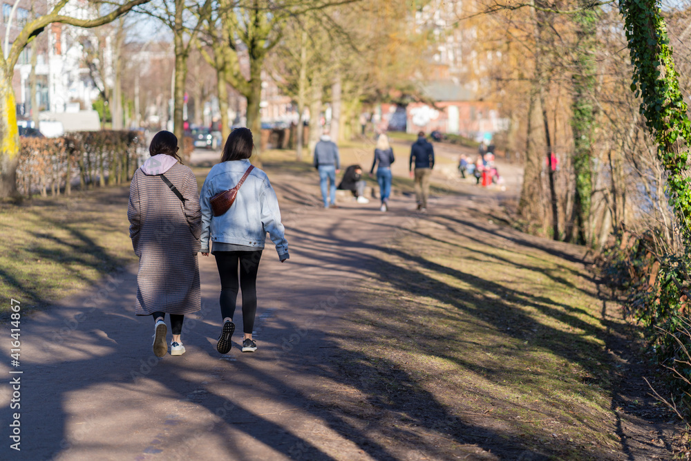two friends go for a spring walk in the park