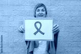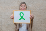 Woman holds a sign with a green ribbon for awareness and support of people living with disease. Awareness of liver cancer, kidney cancer, gallbladder cancer and lymphoma. Mental, Psychosocial support
