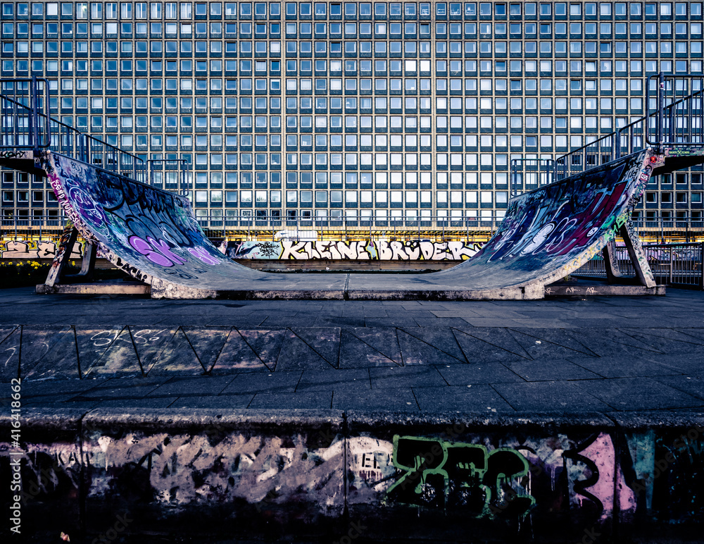Half pipe in front of a block of flats