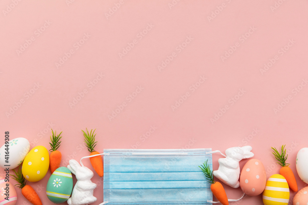 Easter springtime coronavirus background. Protective face mask with easter decorations