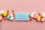 Easter springtime coronavirus background. Protective face mask with easter decorations