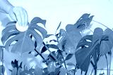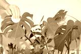 Gardening Home. Taking care of the house and clean air at home. Woman waters and washes green plants in home bath. Concept of home garden, garden room gardening, plant room, watering and plant care.