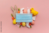 Easter springtime coronavirus background. Protective face mask with easter decorations