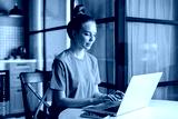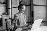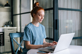 Side view of smiling redhead young woman working typing on laptop computer sitting at table in kitchen room. Concept of remote working from home office during quarantine from COVID-19.