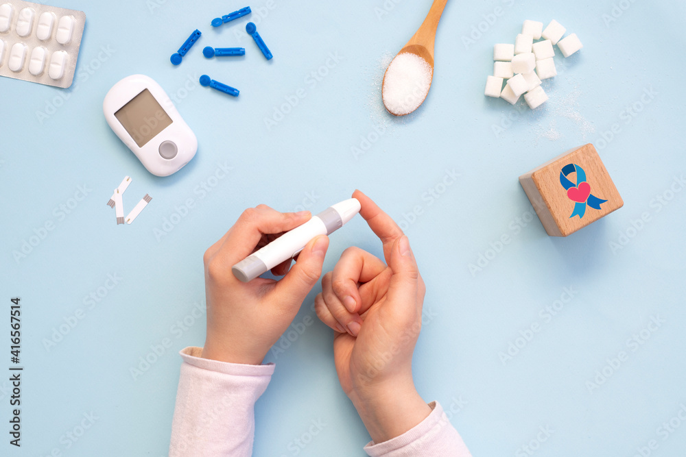Woman using glucometer on blue background, top view