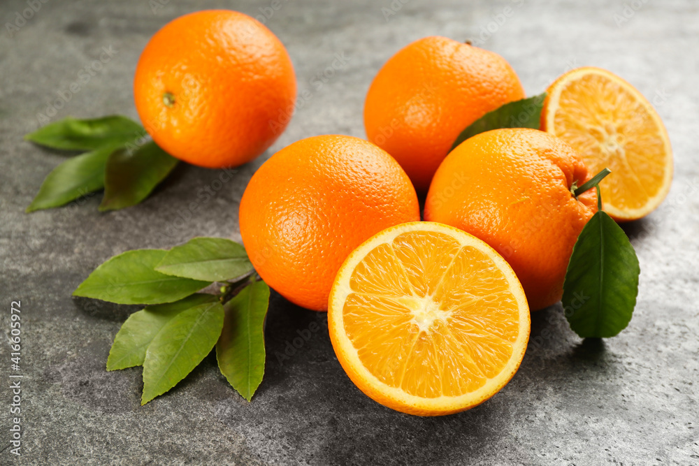 Whole and cut delicious ripe oranges on grey table