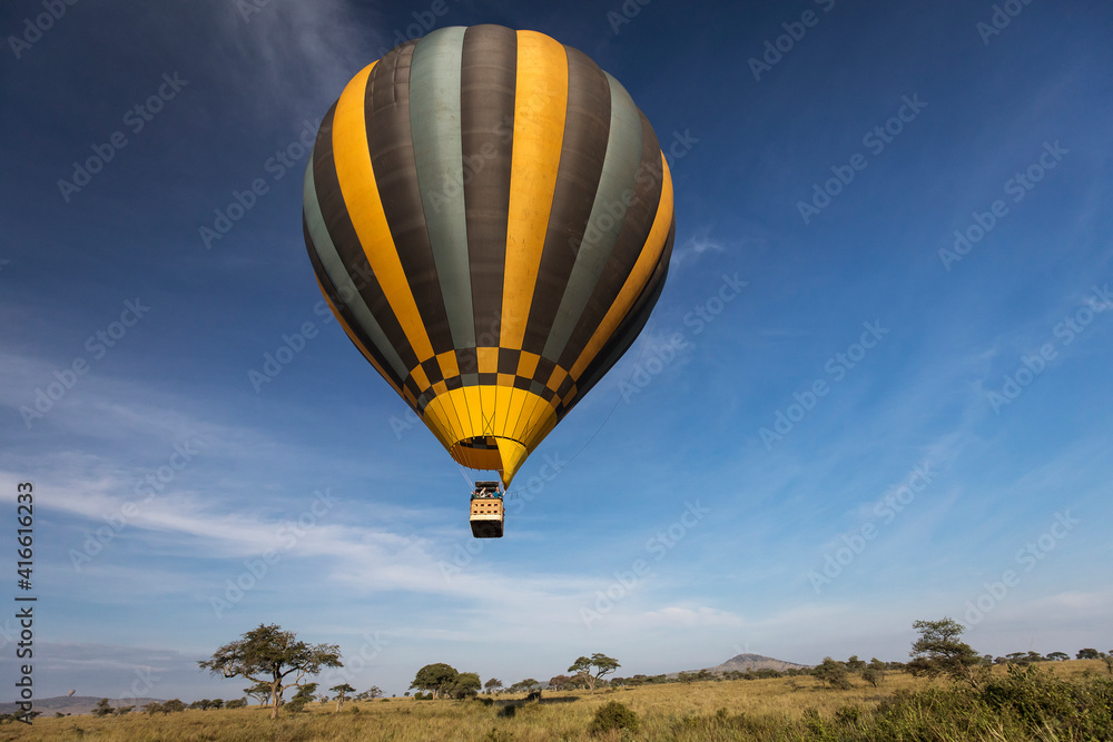 Balloon over savana during safari in Serengeti National Park, Tanzania. Wild nature of Africa