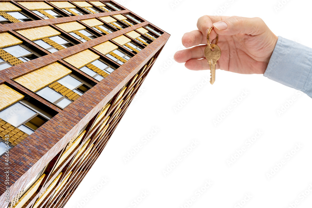 Apartment key in a man's hand. Brass house door lock key. Modern building, view from below. Architecture in modern city.