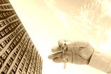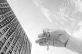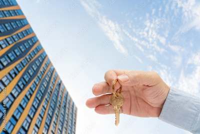 Apartment key in a man's hand. Brass house door lock key. Modern building against the blue sky. View from below.