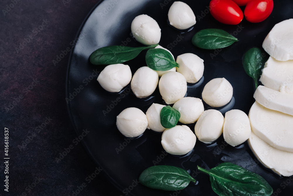 White small mozzarella cheese balls, spinach leaves and tomatoes on black plate.