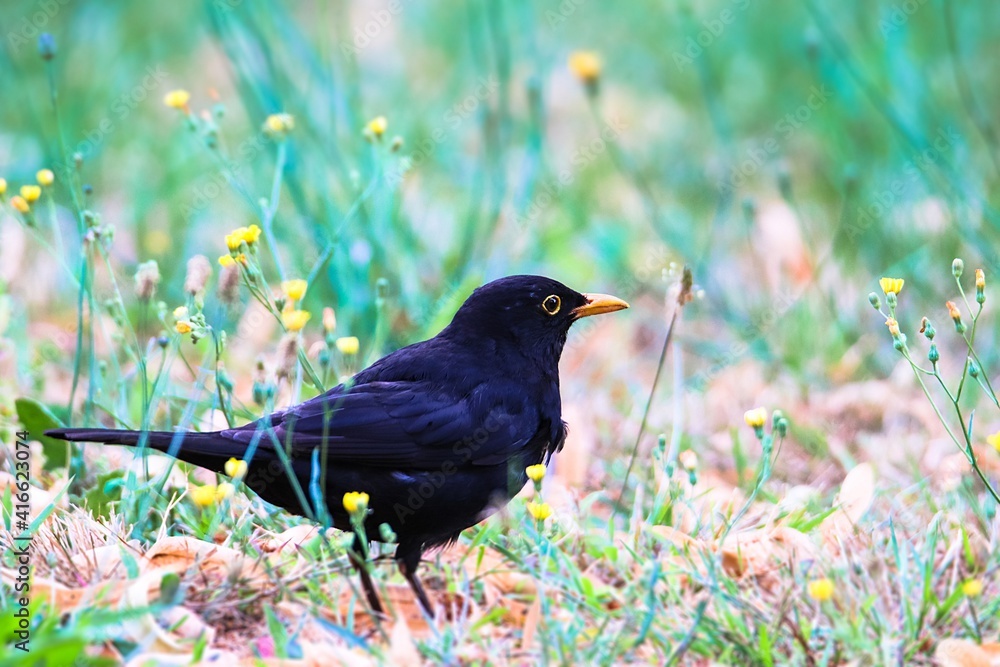 Blackbird male bird observing eating on grass. Black brown blackbird songbird sitting and eating insects and worms on garden with out of focus green bokeh background. Bird wildlife scene.