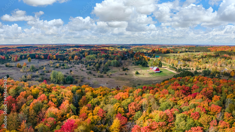 Colorful scenic drive in autumn through the central Michigan countryside near Cadillac - Farm and Red Barn