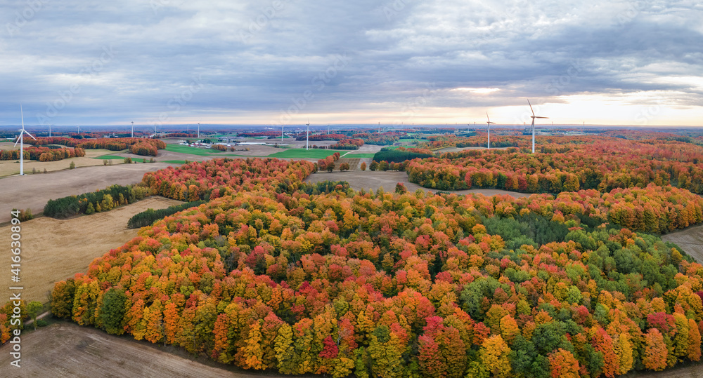 Autumn sunrise with wind turbines in central Michigan farmland near Cadillac Michigan