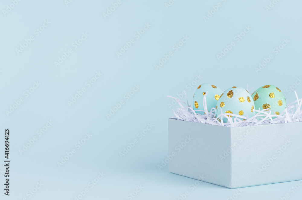 Bright and laconic easter background with blue eggs with golden dots in gift box on blue backdrop, closeup.