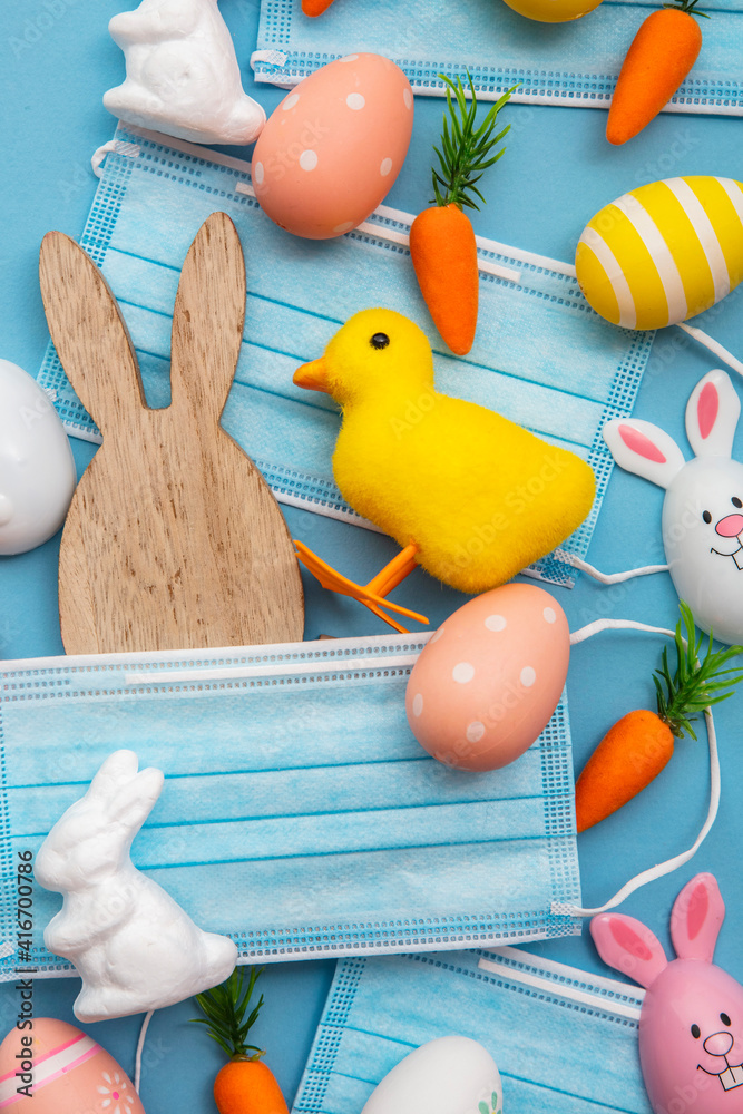 Easter springtime coronavirus background. Protective face mask with easter decorations