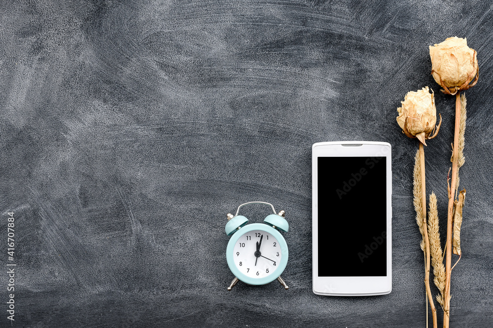 Fashionable stationery background on black-smartphone, Parker pens and dried flowers.