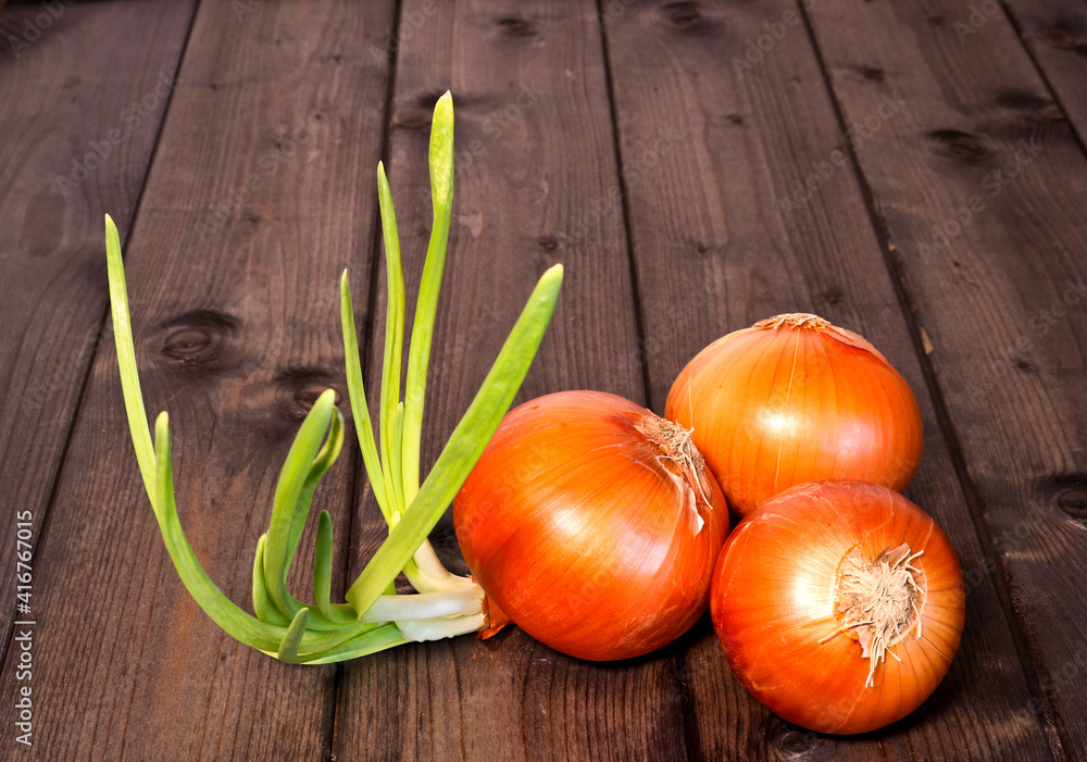Young sprouts of sprouted onions, vegan food. Three bulbs on a dark background.