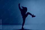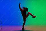 Modern. Stylish sportive girl dancing hip-hop in stylish clothes on colorful background at dance hall in neon light. Youth culture, movement, style and fashion, action. Fashionable bright portrait.