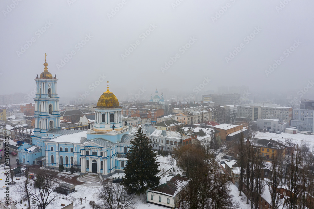 City Sumy in the fog Ukraine at the winter aerial view
