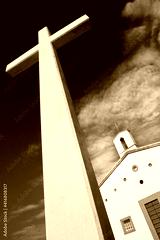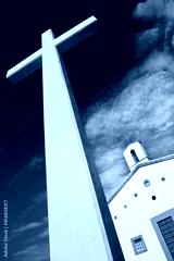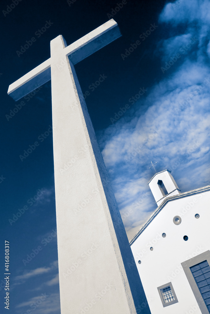 Christian high cross with small church against a dramatic sky