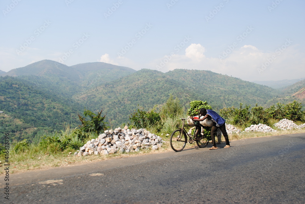 Transport de bananes à vélo dans la campagne au Burundi, Afrique