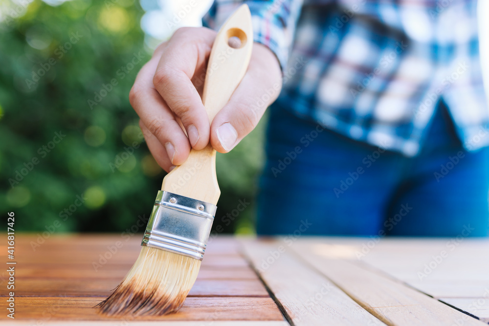 young woman painting wooden exotic wood table in the garden with a brush