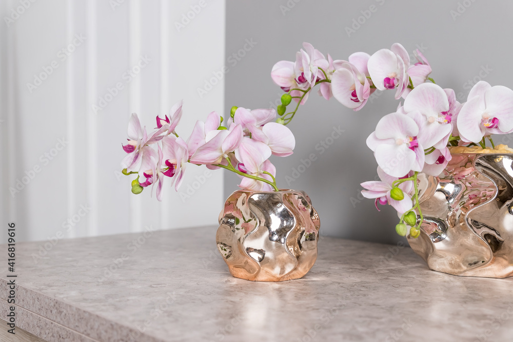 pink orchid flowers in golden vase on a marble table.home decoration concept.Modern geometric vase with orchid flower on pastel background.copy space