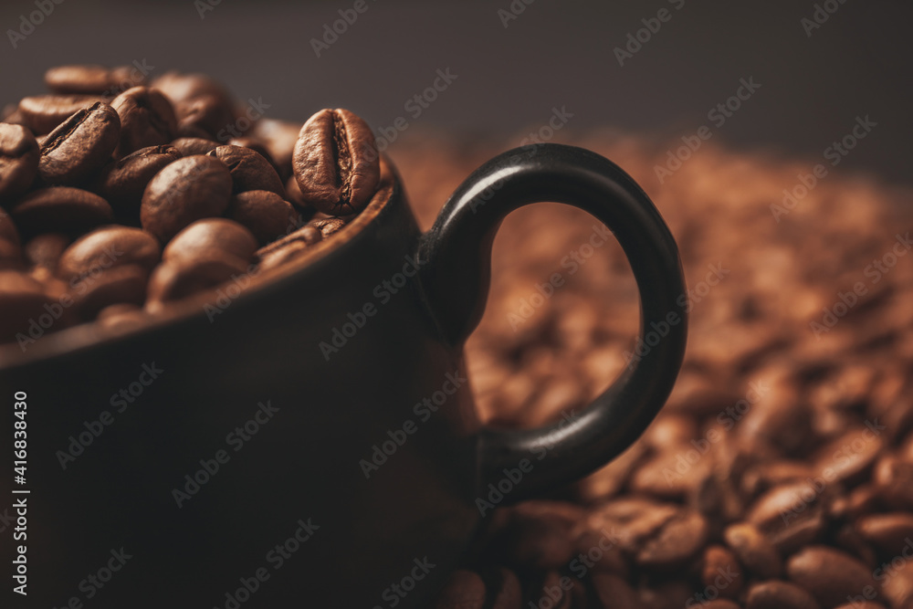 Coffee cup full with coffee beans, close up shoot. Coffee background concept. `Shallow depth of field on coffee bean in cup.