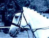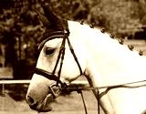 Headshot portrait close up of a beautiful sport horse on show jumping event. Side view head shot of a show jumper horse on natural background