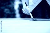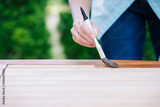 young woman painting wooden exotic wood table in the garden with a brush - shallow depth of field