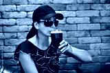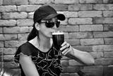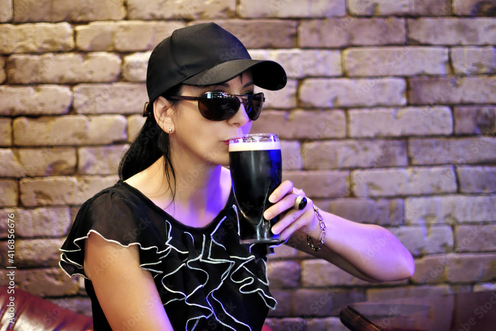 A young woman drinking a glass of beer in a pub.