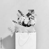 Happy Mothers day. Beautiful and fresh flowers bouquet in paper gift bag over purple background
