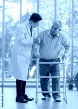 A young male asian doctor wearing white lab coat try to supporting his patient by holding his right arm when an old fat gray hair patient wearing light blue shirt and brown pants standing