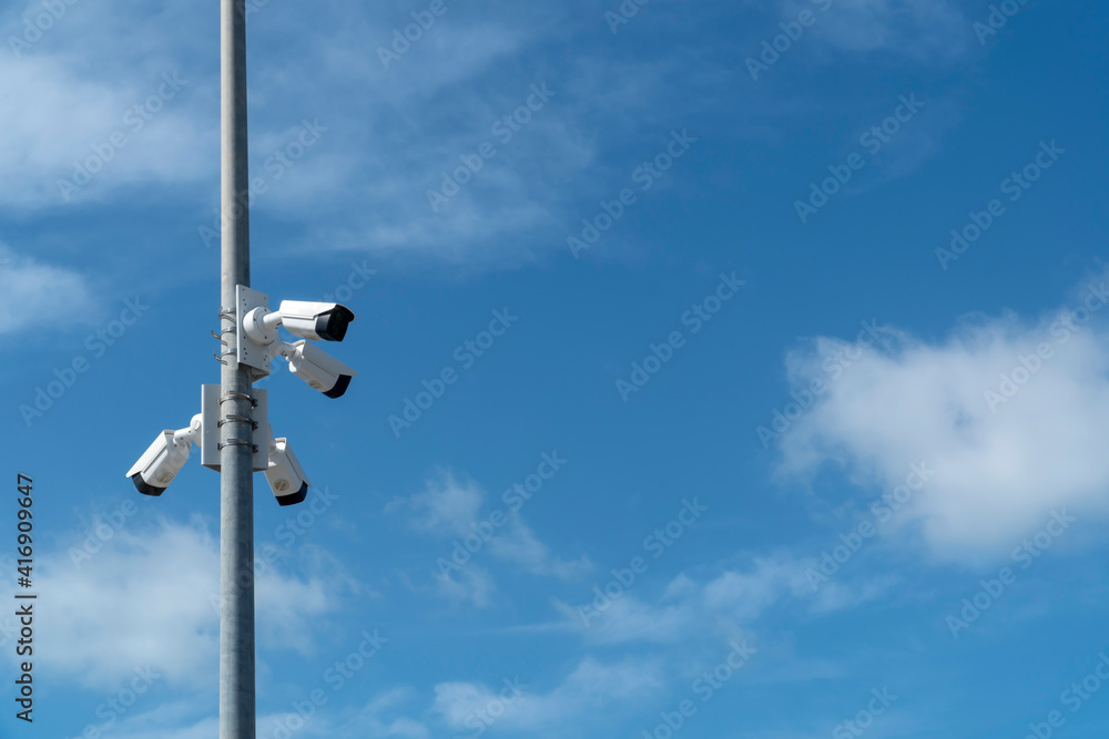 Security systems and alarm technology concept: Many CCTV cameras hanging on a outdoor pol and recording. Digital surveillance. High safety and protection cam and video. Blue sky with copy space.