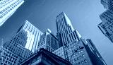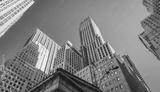 Giant skyscrapers dominate city streets of Wall Street. Lower Manhattan, New York City