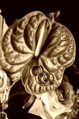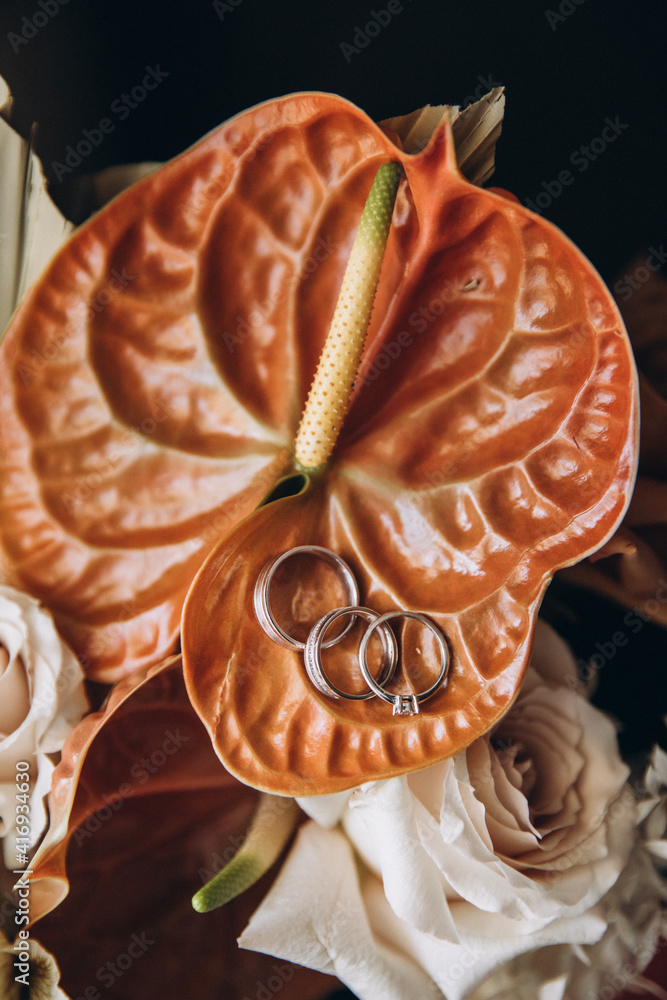 Wedding rings of the bride and groom lie on a flower