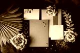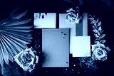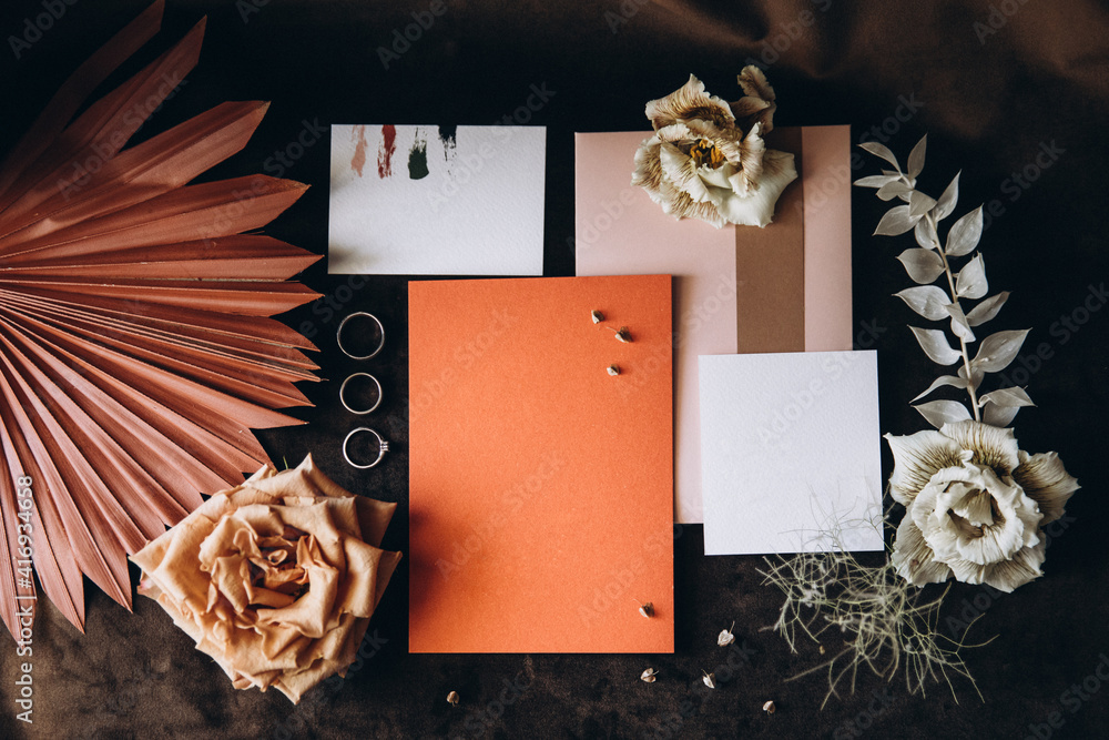 Wedding details. Invitation cards, flowers and rings of the bride and groom lie on a dark textured fabric