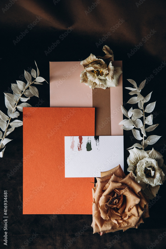 Wedding details. Invitation cards, flowers and rings of the bride and groom lie on a dark textured fabric
