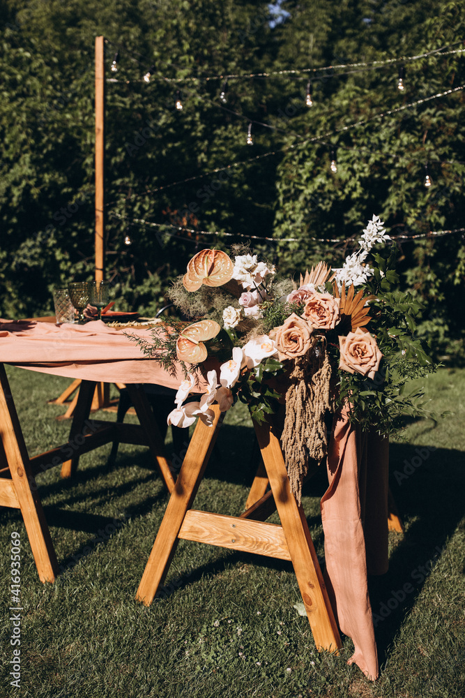 Wedding banquet. A festive wooden table stands in the garden, on the table is a composition of flowers, a tablecloth, glasses and cutlery