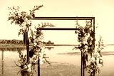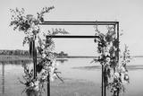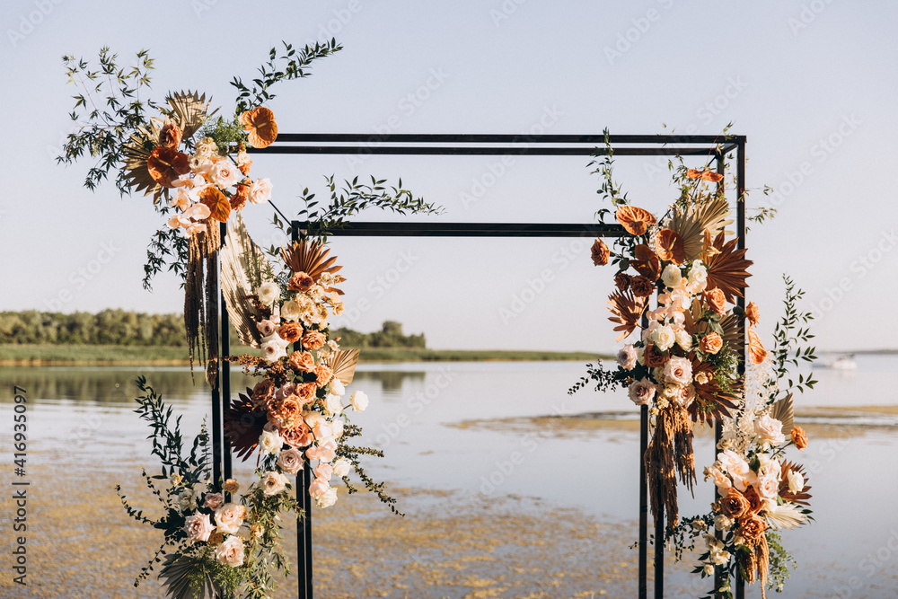Wedding ceremony. On a green meadow on the seashore there is an arch decorated with flower arrangements, chairs for guests, candles and lamps