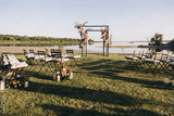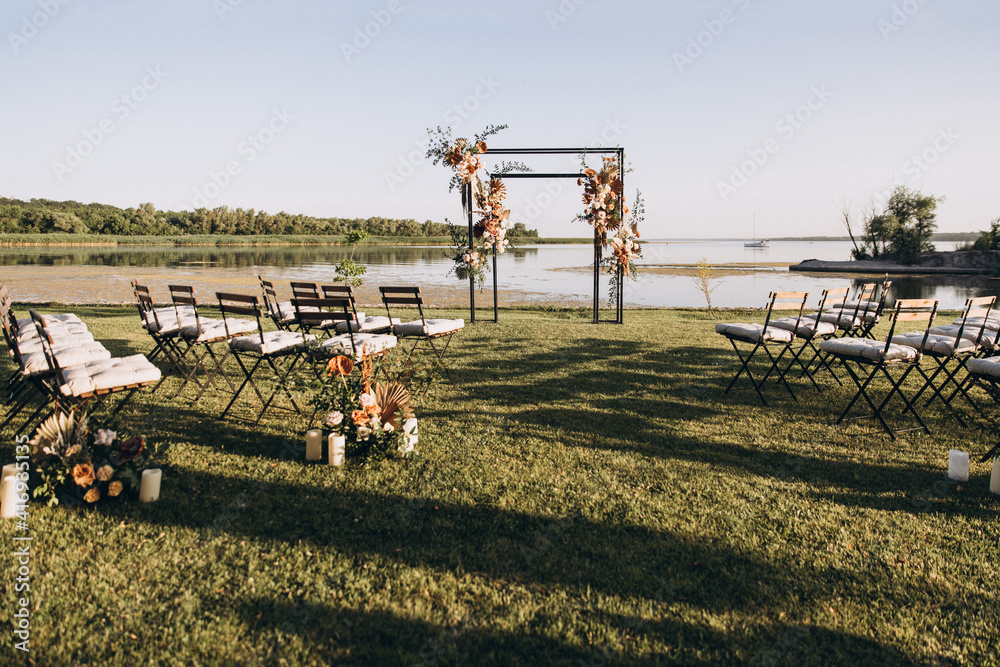 Wedding ceremony. On a green meadow on the seashore there is an arch decorated with flower arrangements, chairs for guests, candles and lamps